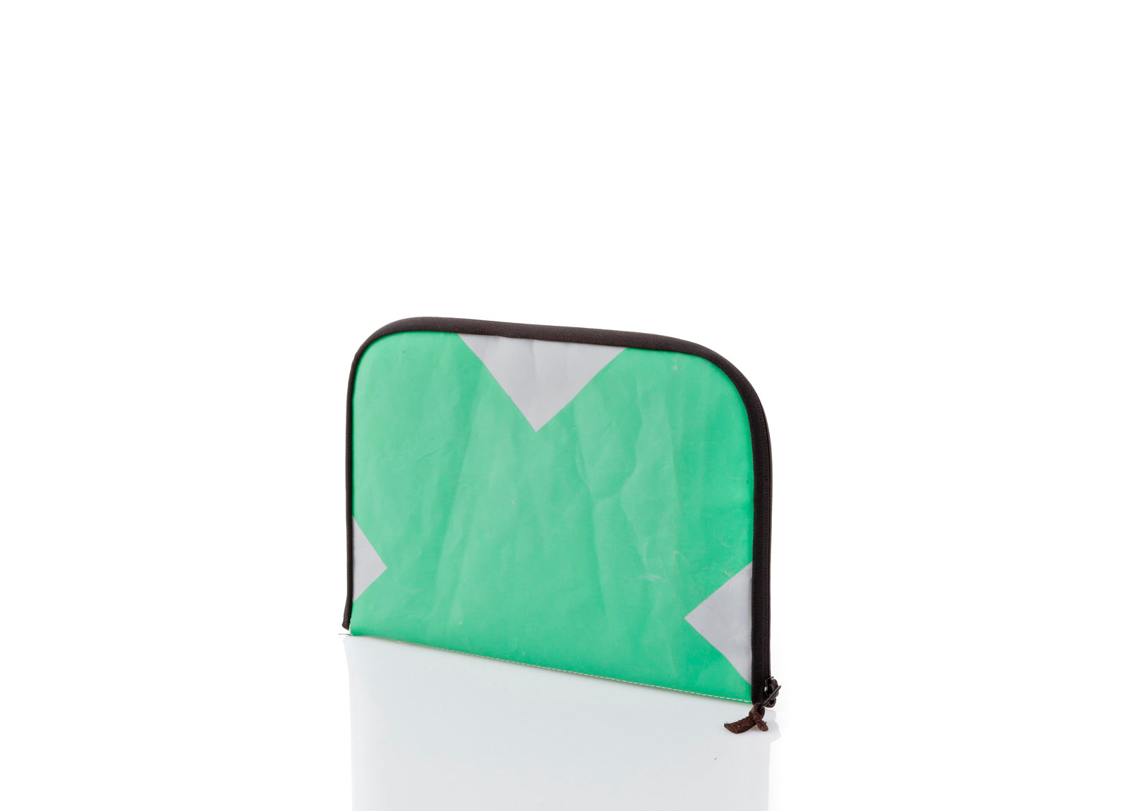 Housse d'ordinateur en toiles de voiles de bateaux recyclées N° : 1/1 Création unique Design : Roger / Beyou créateurs Voile : Grand voile Bateau / skipper : Figaro Océan / course : Transat et Solitaire