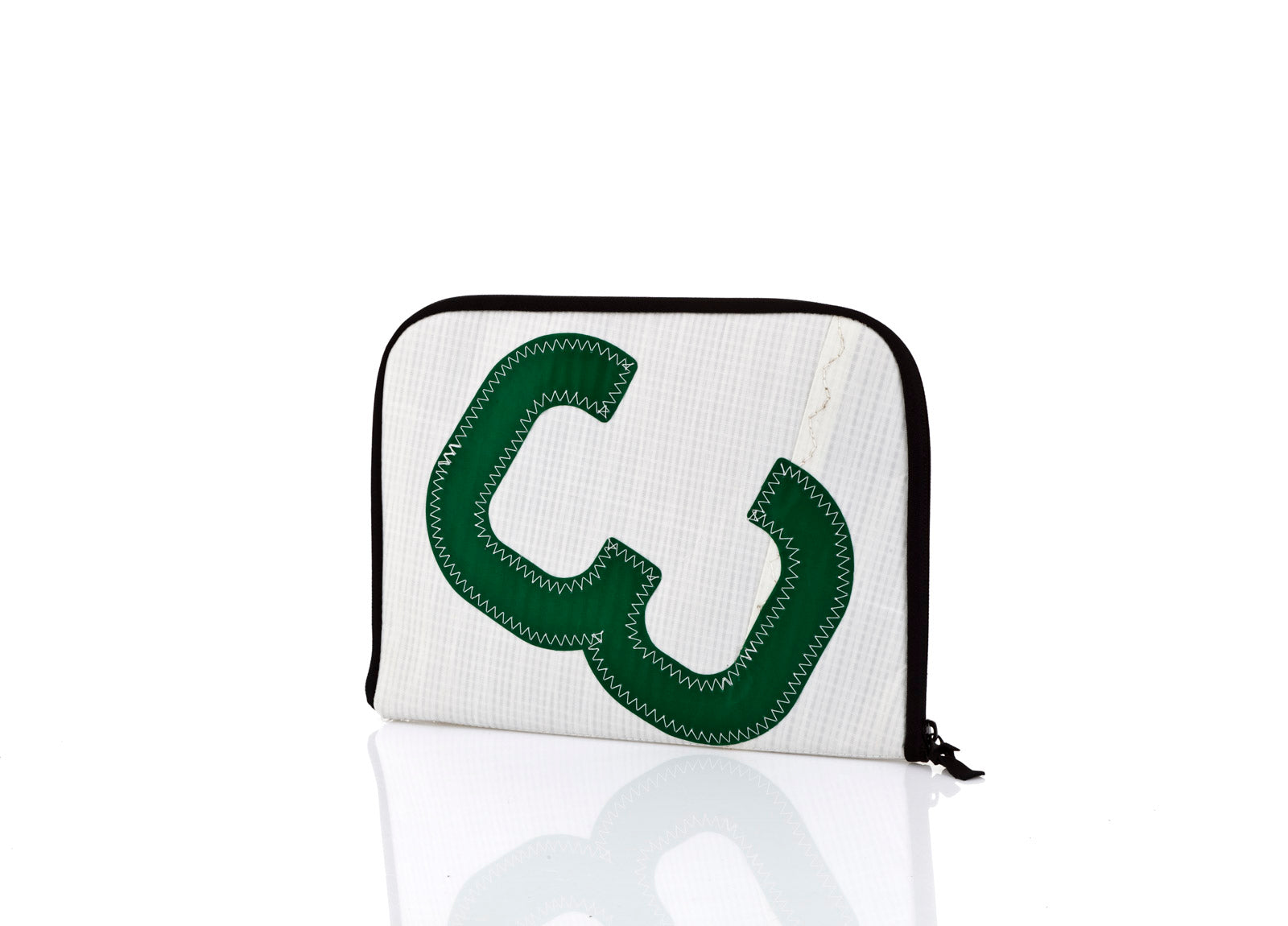 Housse d'ordinateur en toiles de voiles de bateaux recycléesN° : 1/1 Création uniqueDesign : Roger / Beyou créateursVoile : Grand voileBateau / skipper : FigaroOcéan / course : Transat et Solitaire