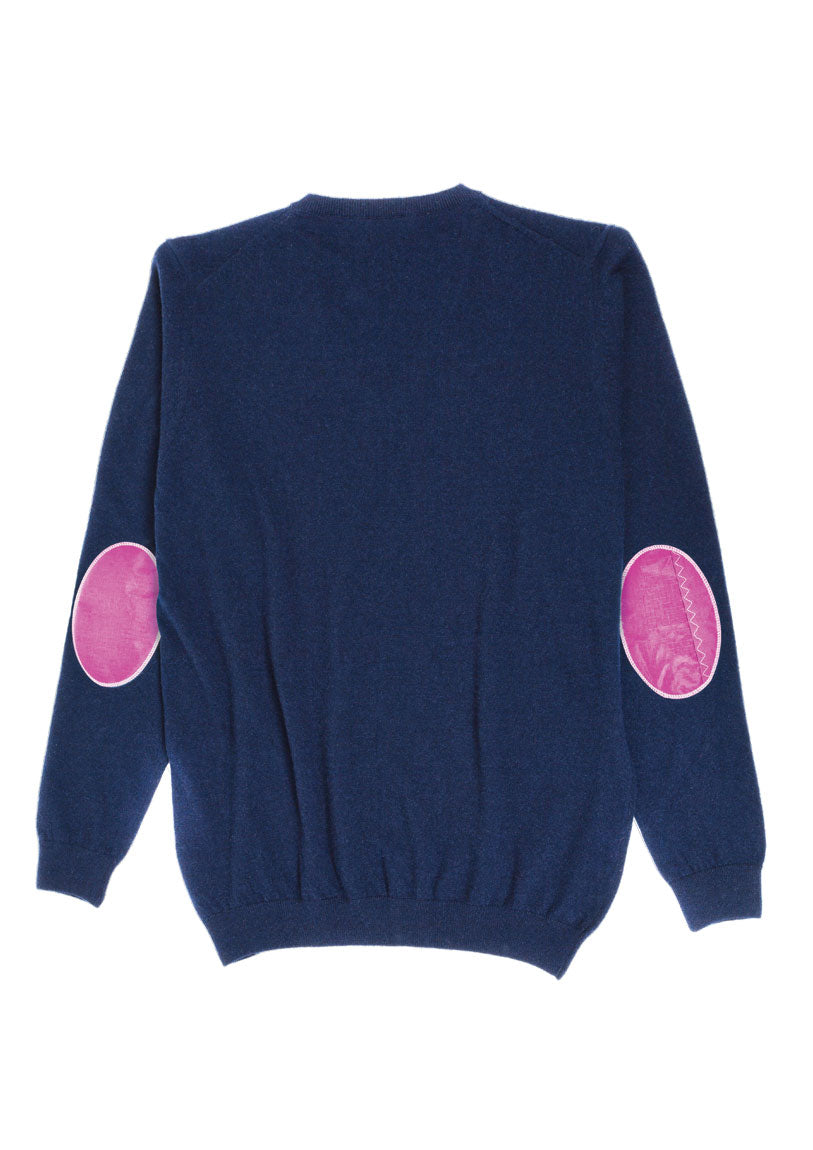 Pull en cachemire bleu et coudières roses en toile de spi de bateau recyclée.Modèle Mixte. Si vous être une femme préférez la taille en dessous de votre taille habituelle. Création unique Design : Beyou / Roger Voile : Spinnaker Bateau / skipper : Monocoque