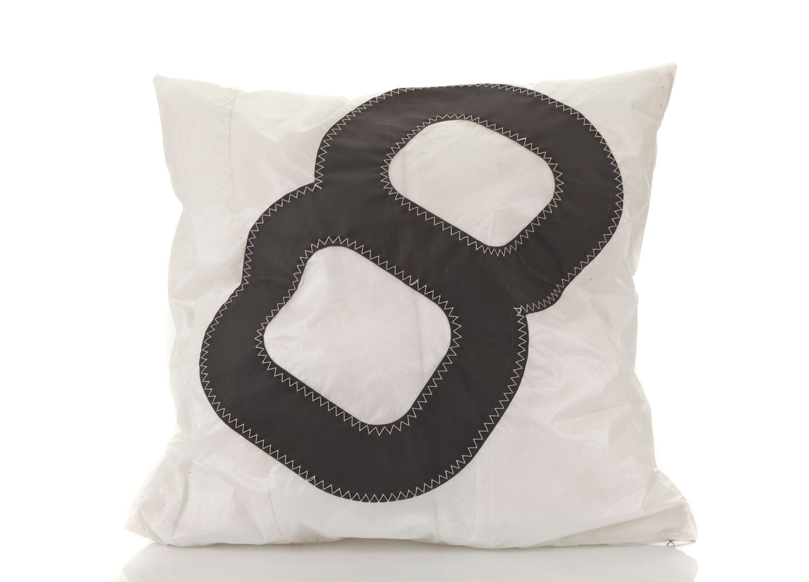 Petit Coussin blanc réalisé en voile de bateau 100% recyclée, avec le chiffre "9" bleu cousu avec notre iconique point zigzag.