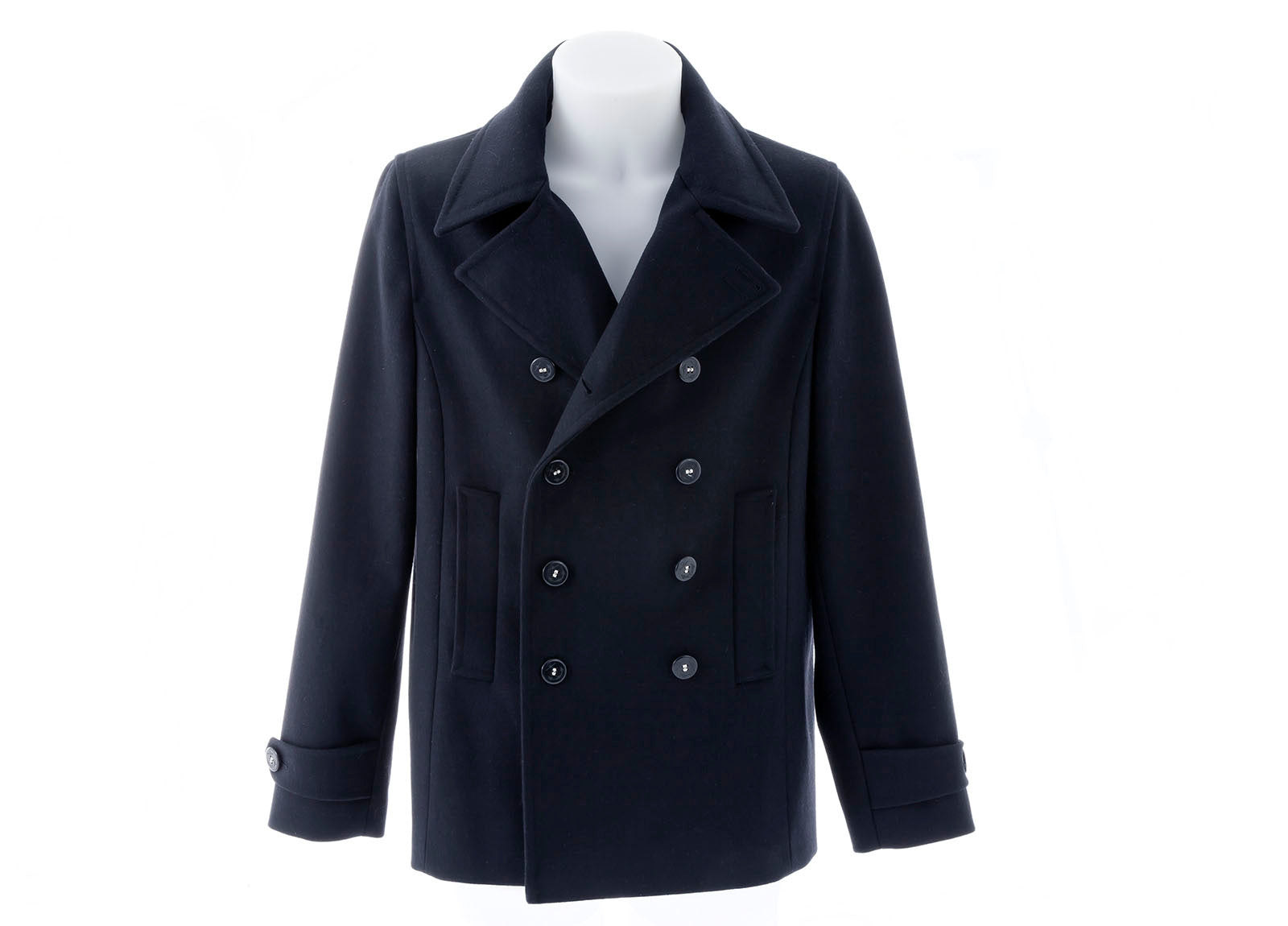 Caban Homme en laine bleu marine avec empiécement en voile recyclée derrière le col. La voile est en matière 100% coton beige.