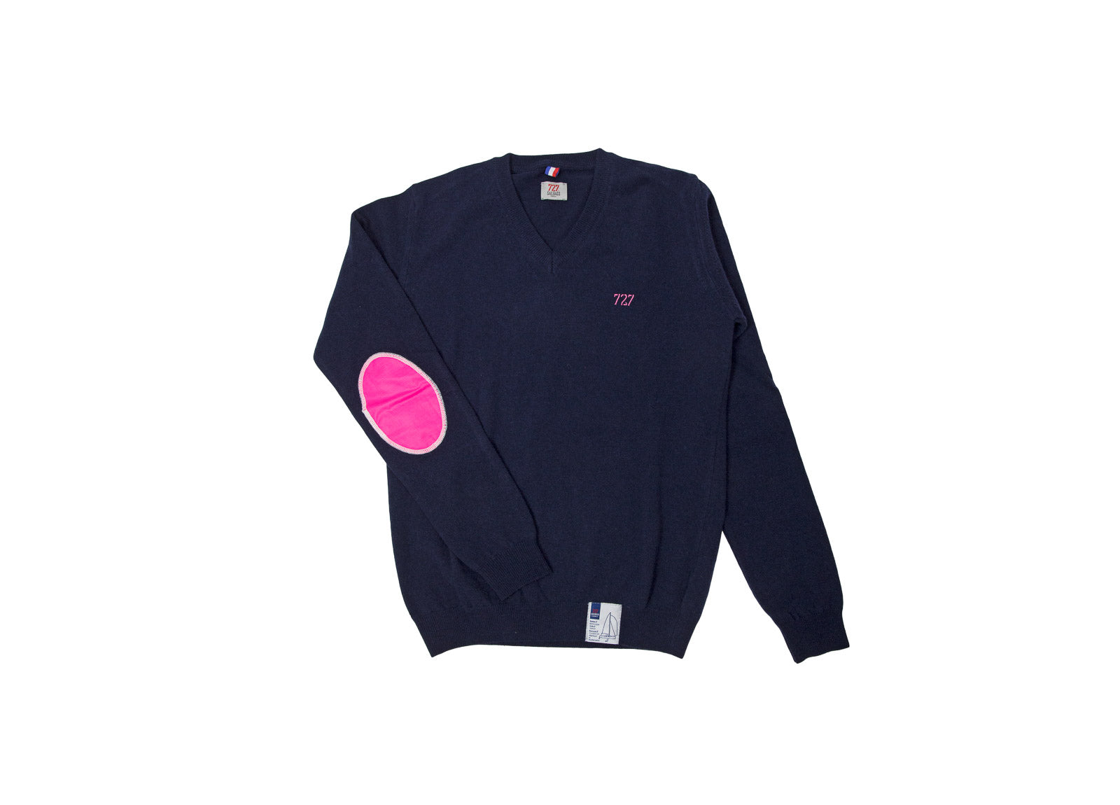 Pull en laine mérinos et cachemire bleu marine, avec coudières en voile de spi rose.