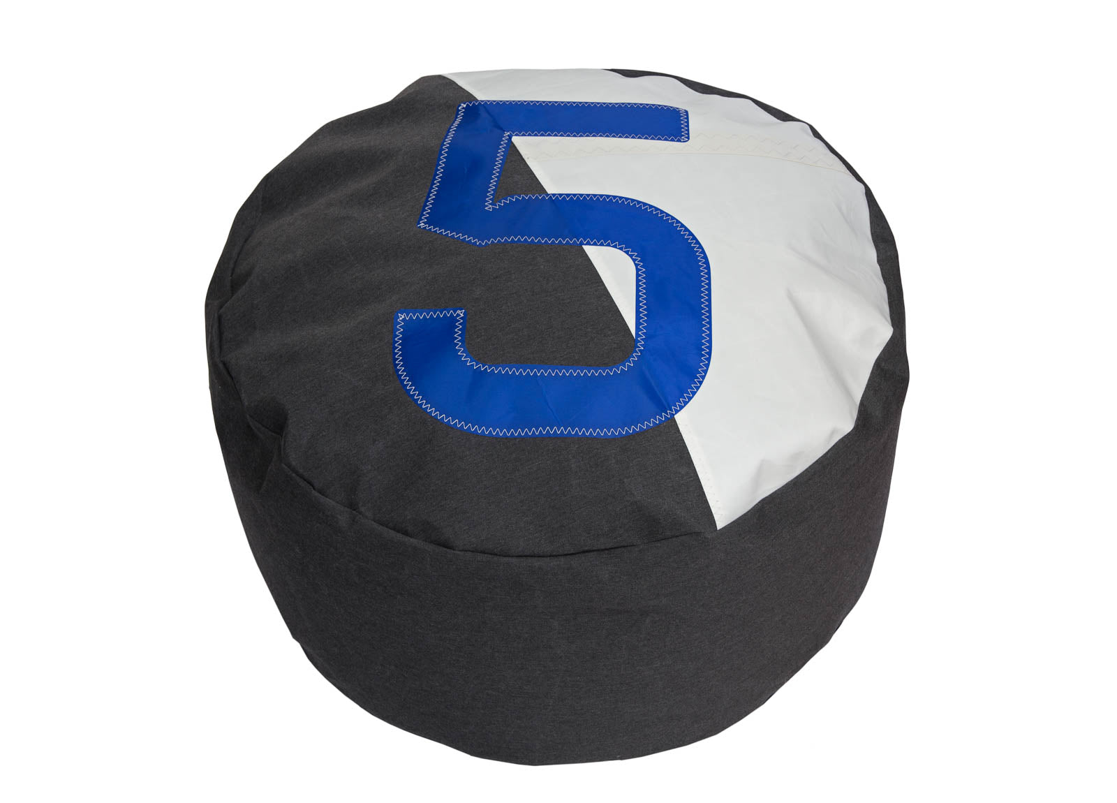 Le Pouf Duo Gris est réalisé en voile de bateau 100% recyclée. Il est composé d'un empiècement tissu gris et du chiffre "5" bleu, cousu avec notre iconique point zigzag. Une fiche d'authentification est cousue et certifie l'origine de la voile.