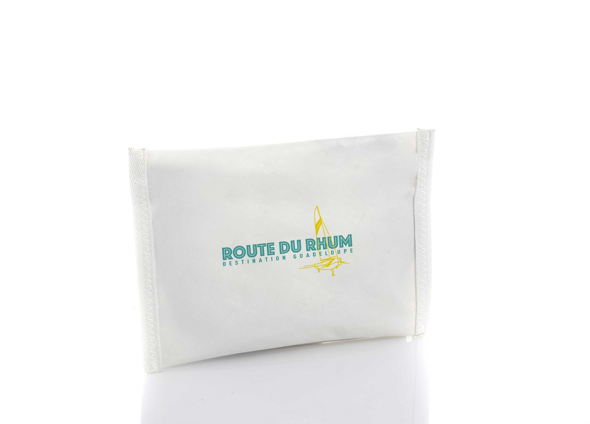 La Pochette Zippée Route du Rhum est conçue avec de la voile 100% recyclée, elle est sérigraphiée aux couleurs de la Route du Rhum Destination Guadeloupe. Le logo 727 Sailbags - Route du Rhum « Destination Guadeloupe » est cousu au dos avec notre iconique point zigzag.