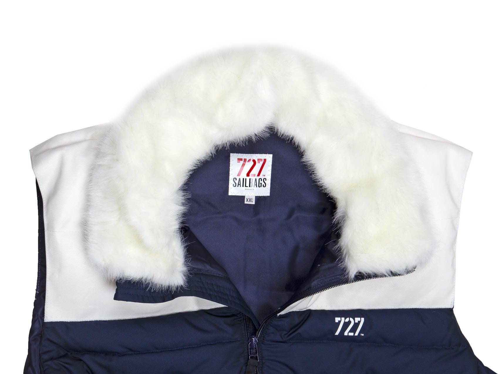 Parka homme sans manche Under the pole, empiècement en voile de bateau recyclée. Col amovible blanc. Design: Beyou / Roger Voile : Grand voile Bateau / skipper : Goëlette polaire / Le Why Océan / course : Pôle Nord