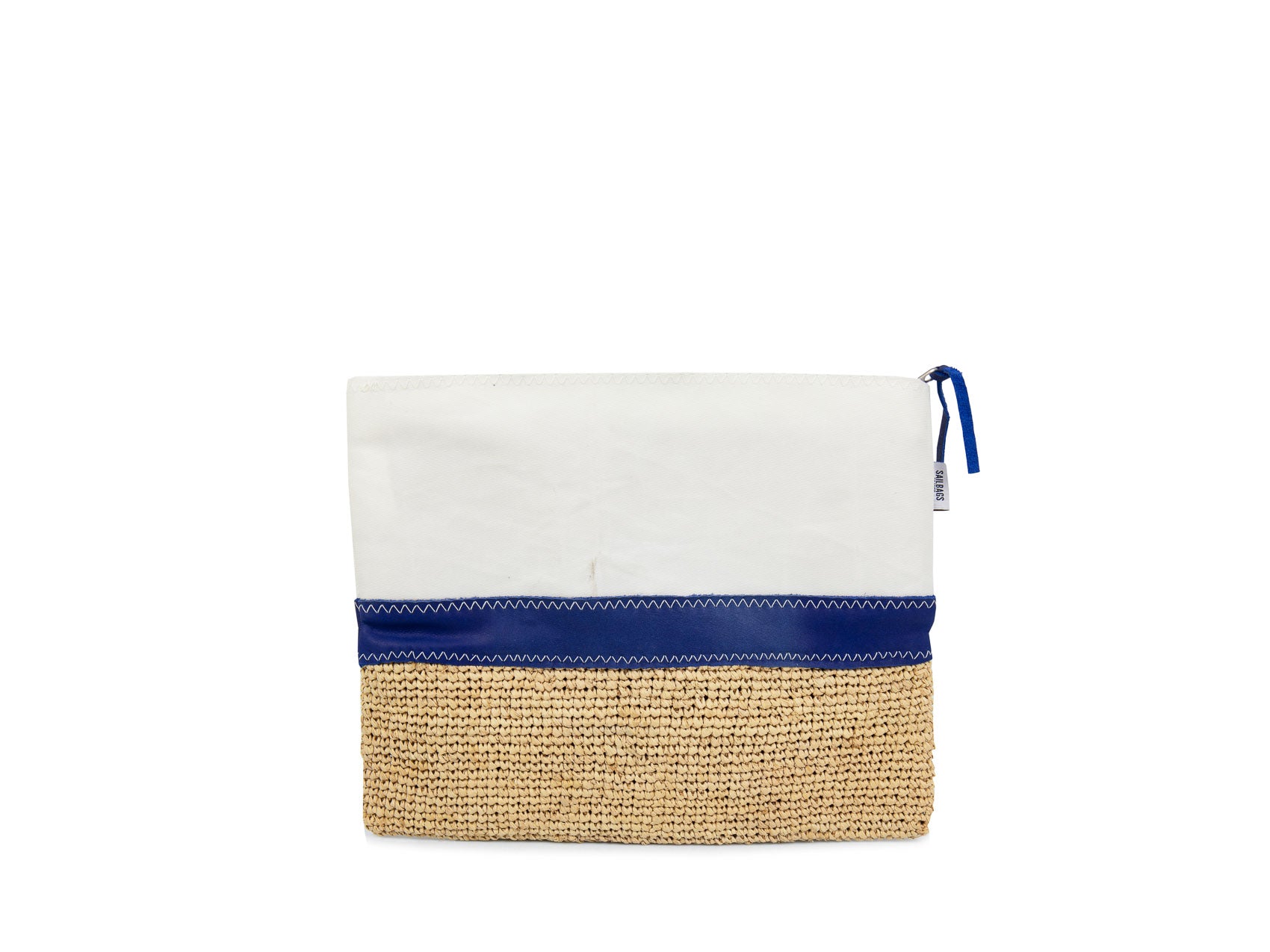 La pochette Mahe est réalisée à partir de raphia et de voile de bateau 100% recyclée.