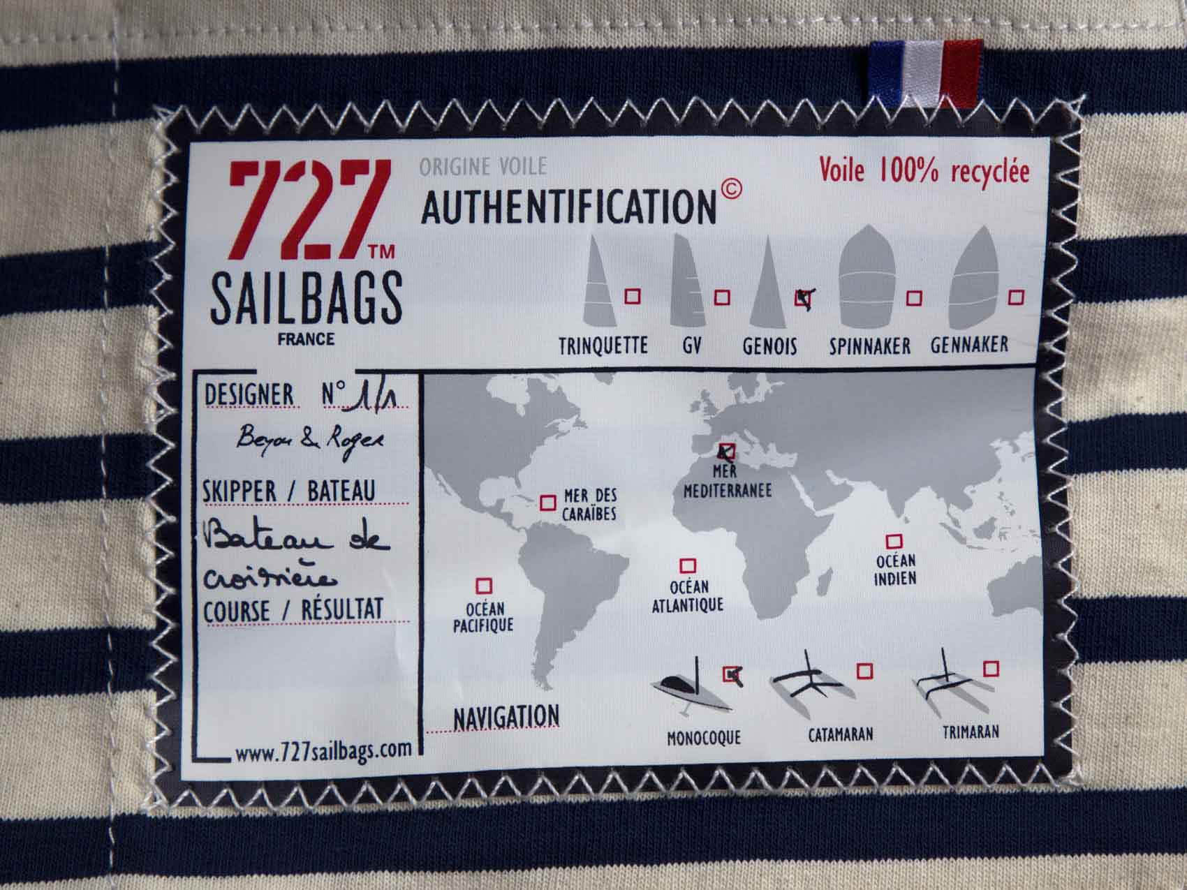 Le sac Sandy est réalisé à partir de voile de bateau 100% recyclée.Un certificat d?origine est cousu à l?intérieur et raconte l?histoire de la voile.Ce sac est composé d'une base en cuir, et d'un chiffre cousu avec notre iconique point zigzag.Intérieur doublé en marinière.