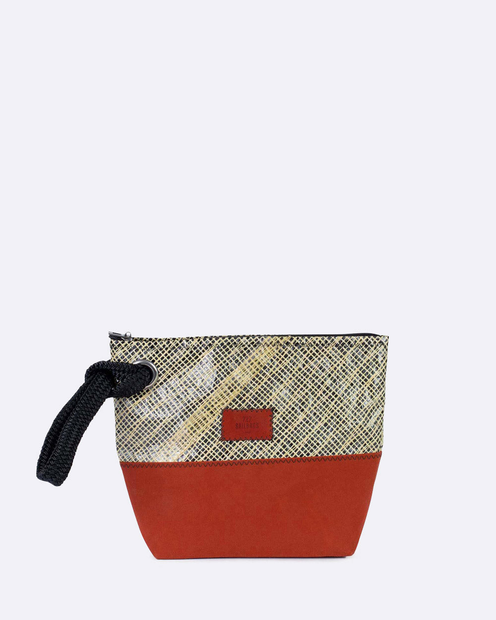 Inspirée des terres littorales de la côte méditerranéenne, aux multiples ocres, la collection évoque la chaleur de la pierre, la végétation dorée en fin d'été, l?odeur du thym et les couleurs d?automne. La Midinette Esterel est une petite pochette qui permet de rassembler les éléments nécessaires à votre journée. Elle se porte à la main. Elle peut être utilisée comme trousse de toilette ou comme un accessoire de voyage.Sa conception en voile technique beige 100% recyclée et sa base Terre de feu, lui donneront charme et robustesse pour tout utilisation : en soirée, pour tous les jours ou en balade !