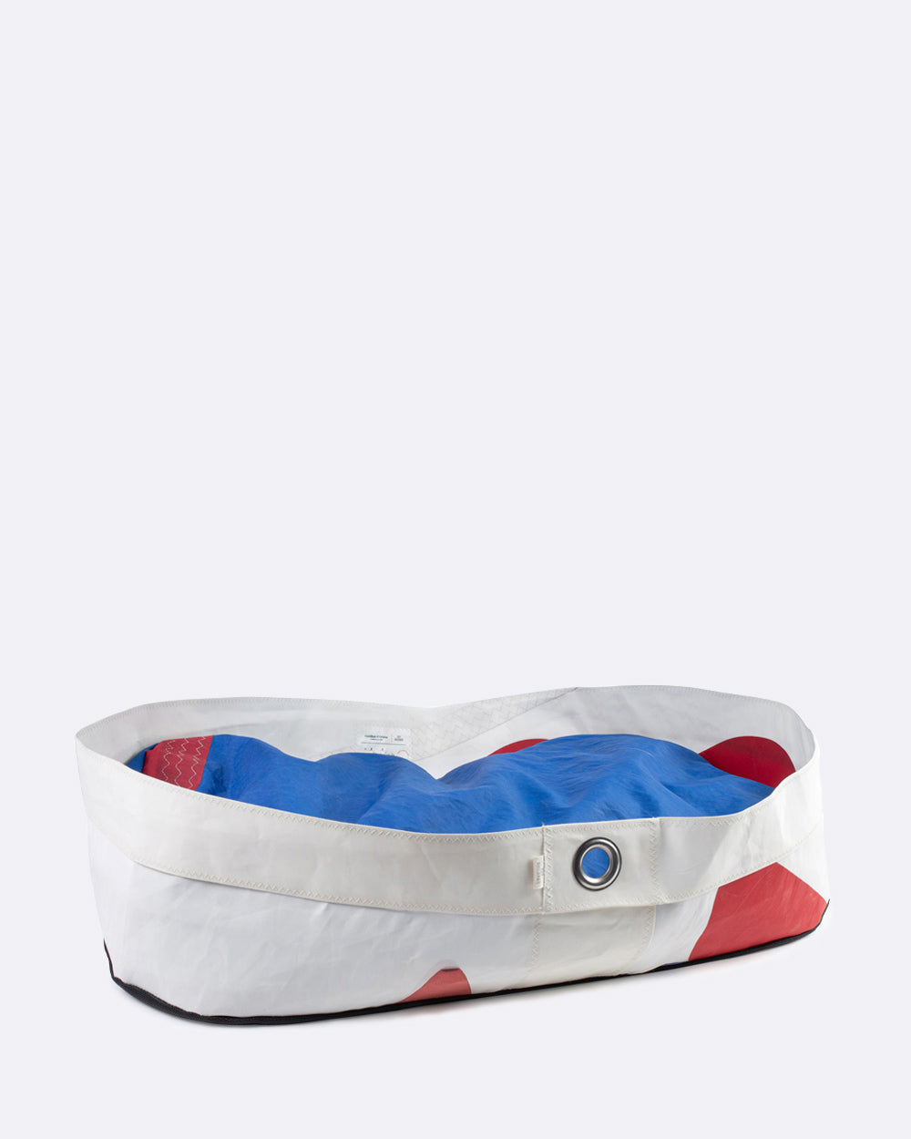 Pour le confort de votre animal de compagnie, que diriez-vous d?un nid douillet en voiles recyclées, moelleux et durable ?Son enveloppe extérieure en voile de dacron recyclée est constituée d?un fond tamisé antidérapant qui laisse respirer et évacuer les odeurs tout en étant facile d?entretien. Un jet d?eau suffit pour faire disparaître les poils.Pour le confort optimal de votre chien ou de votre chat et un sommeil de qualité qui soulage et détend, le rembourrage du coussin est composé de copeaux de combinaisons néoprènes recyclées par Soöruz, à la Rochelle. Ce coussin est déhoussable. La housse en spinnaker recyclé se lave en machine et la doublure en coton apporte une résistance supérieure.C?est un panier pour chiens, chiots, chats et chatons conçu comme un divan pour favoriser chez nos petits compagnons de belles nuits douces et apaisées.Le produit est fabriqué à l'unité. La partie extérieure est principalement en voile blanche avec des parties en rouge ou en bleu en fonction des voiles.