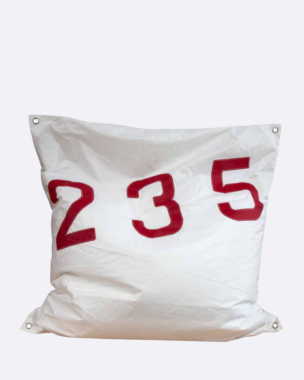 Le Maxi Pouf Rouge est réalisé en voile de bateau 100% recyclée, le numéro "235" rouge y est cousu avec notre iconique point zigzag. Une fiche d'authentification est cousue et certifie l'origine de la voile.
