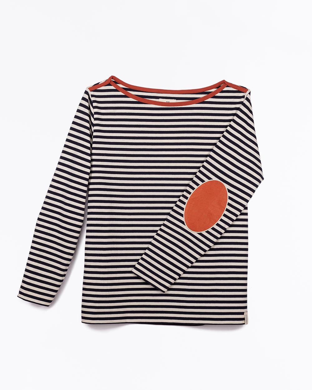Indétrônable de la garde-robe bretonne, la marinière se réinvente chez 727 Sailbags avec des coudières originales en spinnakers recyclés.La marinière Nantucket est confectionnée en coton léger, respirant et fluide, pour une silhouette décontractée et un confort de chaque instant. Sa couleur écrue chamarrée de fines rayures noires nous embarque à bord des baleiniers du Massachusetts d?autrefois, guidés par le phare rouge historique de l?île de Nantucket. La coupe classique de cette marinière se pare de coudières couleur rouille en spinnaker 100% recyclé, fin et souple pour une belle liberté de mouvement.Intemporelle, élégante et confortable, la marinière Nantucket s?enfile sans hésiter, au fil des saisons et des destinations, pour emplir votre journée d?air iodée.