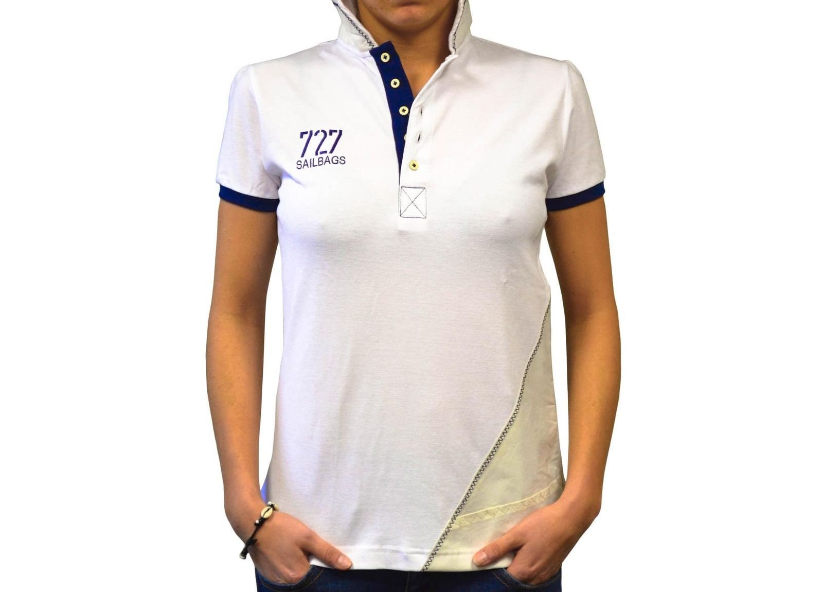 Polo manches courtes en coton et voile recyclée5 boutonsManche « froncée »Voile recyclée : arrière col et buste gaucheDoublage de la voile avec cotonFiche d?authentification brodée intérieur col
