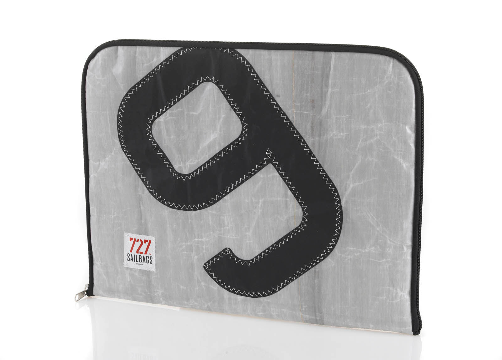 Housse d'ordinateur en toiles de voiles de bateaux recyclées N° : 1/1 Création unique Design : Roger / Beyou créateurs Voile : Grand voile Bateau / skipper : Open 60' Océan / course : Tour du monde en solitaire