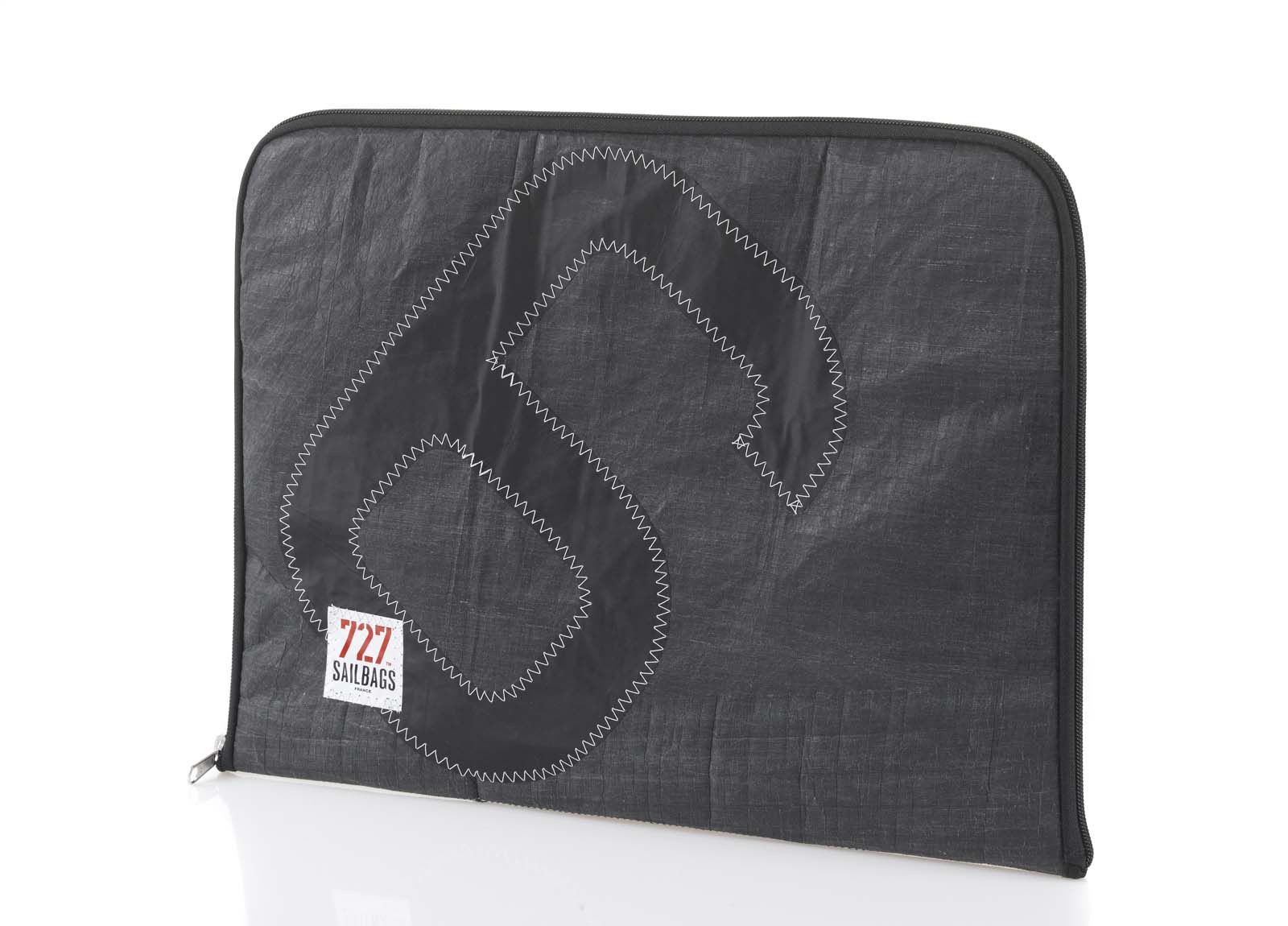 Housse d'ordinateur en toiles de voiles de bateaux recyclées N° : 1/1 Création unique Design : Roger / Beyou créateurs Voile : Grand voile Bateau / skipper : VOR 70' Océan / course : Tour du monde en solitaire