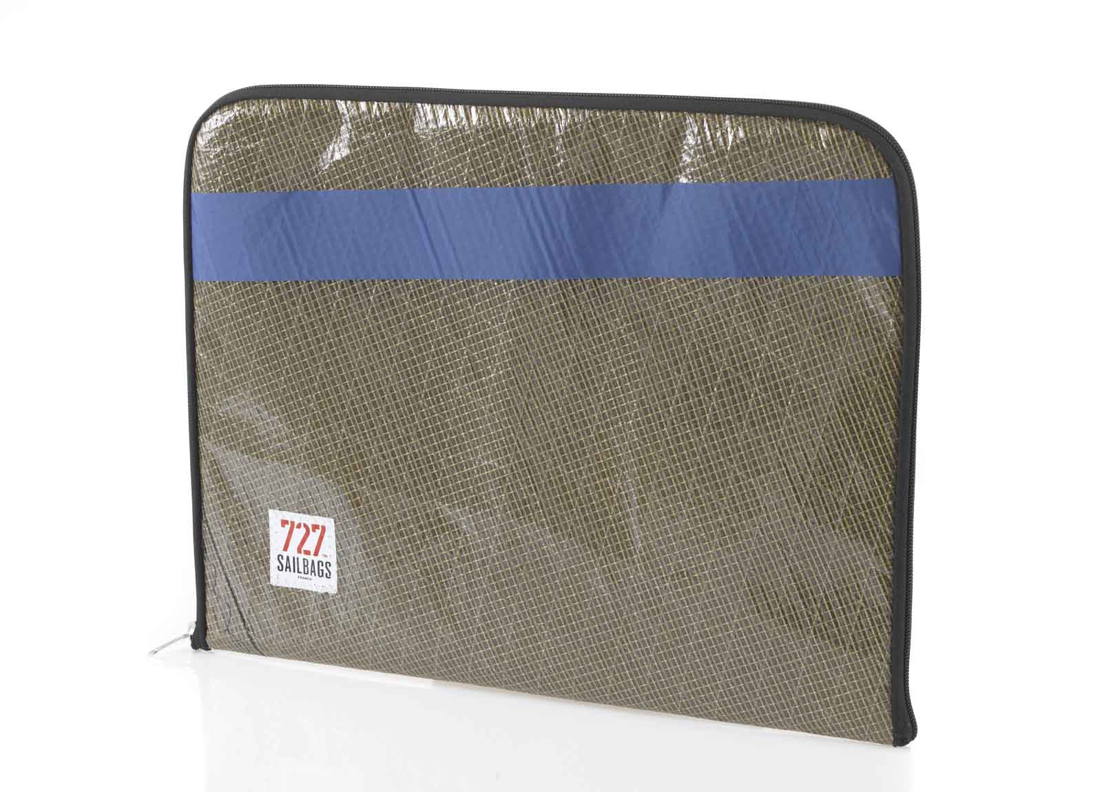 Housse d'ordinateur en toiles de voiles de bateaux recyclées N° : 1/1 Création unique Design : Roger / Beyou créateurs Voile : Gennaker Bateau / skipper : Mari-Cha III Océan / course : Atlantique, Méditerranée, Caraïbes