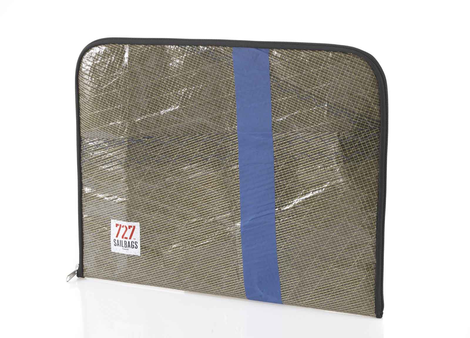 Housse d'ordinateur en toiles de voiles de bateaux recyclées N° : 1/1 Création unique Design : Roger / Beyou créateurs Voile : Gennaker Bateau / skipper : Mari-Cha III Océan / course : Atlantique, Méditerranée, Caraïbes
