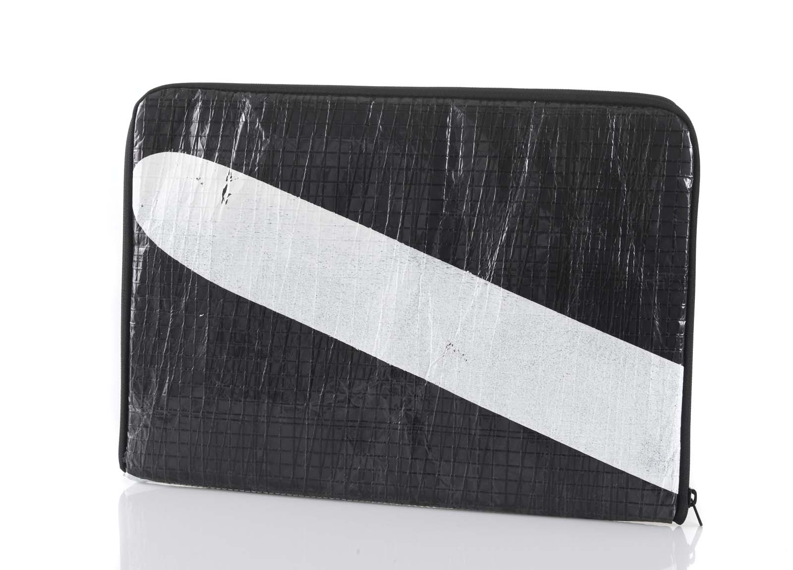 Housse d'ordinateur en toiles de voiles de bateaux recyclées N° : 1/1 Création unique Design : Roger / Beyou créateurs Voile : Gennaker Bateau / skipper : Open 60' Océan / course : Tour du monde en solitaire
