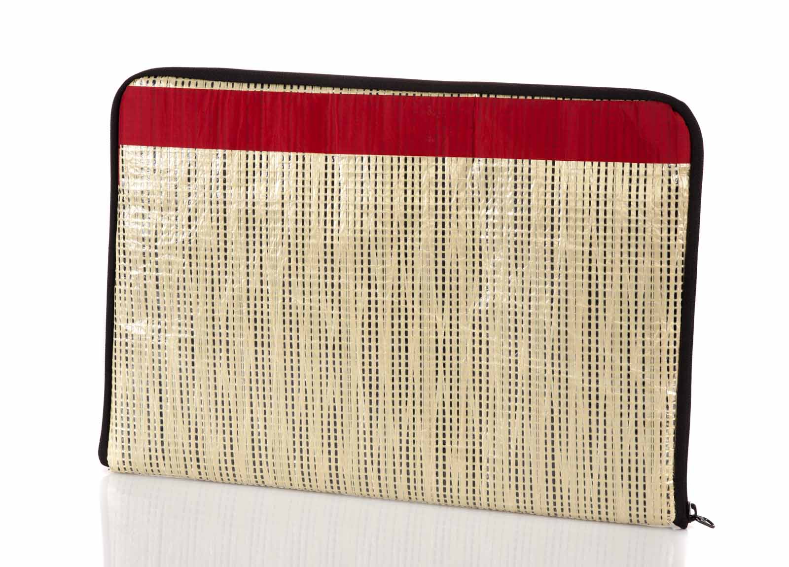 Housse d'ordinateur en toiles de voiles de bateaux recyclées N° : 1/1 Création unique Design : Roger / Beyou créateurs Voile : Génois Bateau / skipper : Figaro II Océan / course : Solitaire + Transat