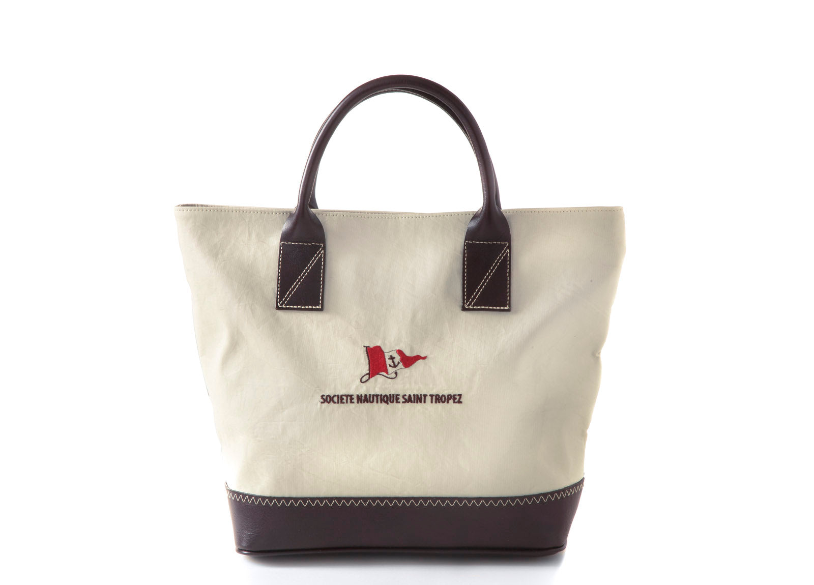 Housse d'ordinateur en toiles de voiles de bateaux recyclées et cuir, série limitée Société Nautique de Saint-Tropez N° : 1/1 Création unique Design : Roger / Beyou créateurs Voile : Génois Bateau / skipper : 15 M JI Océan / course : Circuit classique méditerranéen