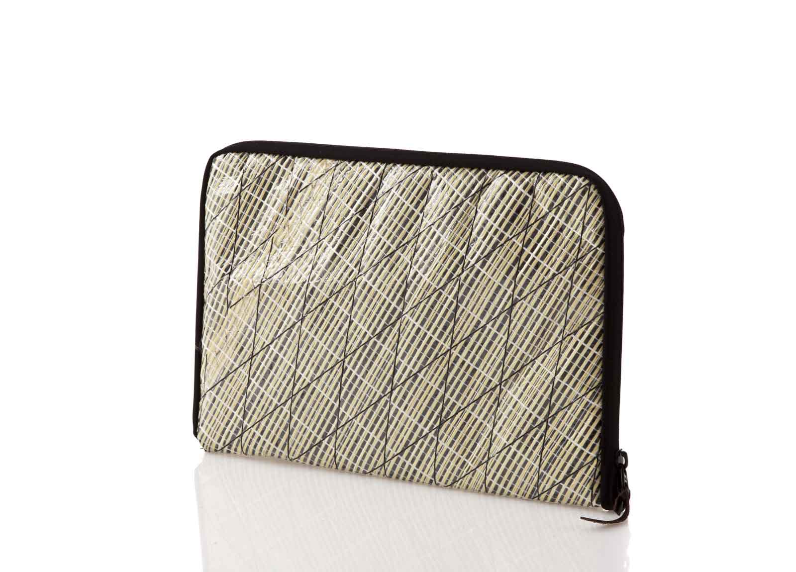 Housse d'ordinateur en toiles de voiles de bateaux recyclées N° : 1/1 Création unique Design : Roger / Beyou créateurs Voile : Génois Bateau / skipper : J120 Océan / course : Mer Méditerranée, Océan Atlantique