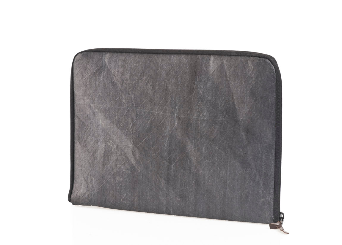 Housse d'ordinateur en toiles de voiles de bateaux recycléesN° : 1/1 Création uniqueDesign : Roger / Beyou créateursVoile : GénoisBateau / skipper : AC72Océan / course : Match Racing