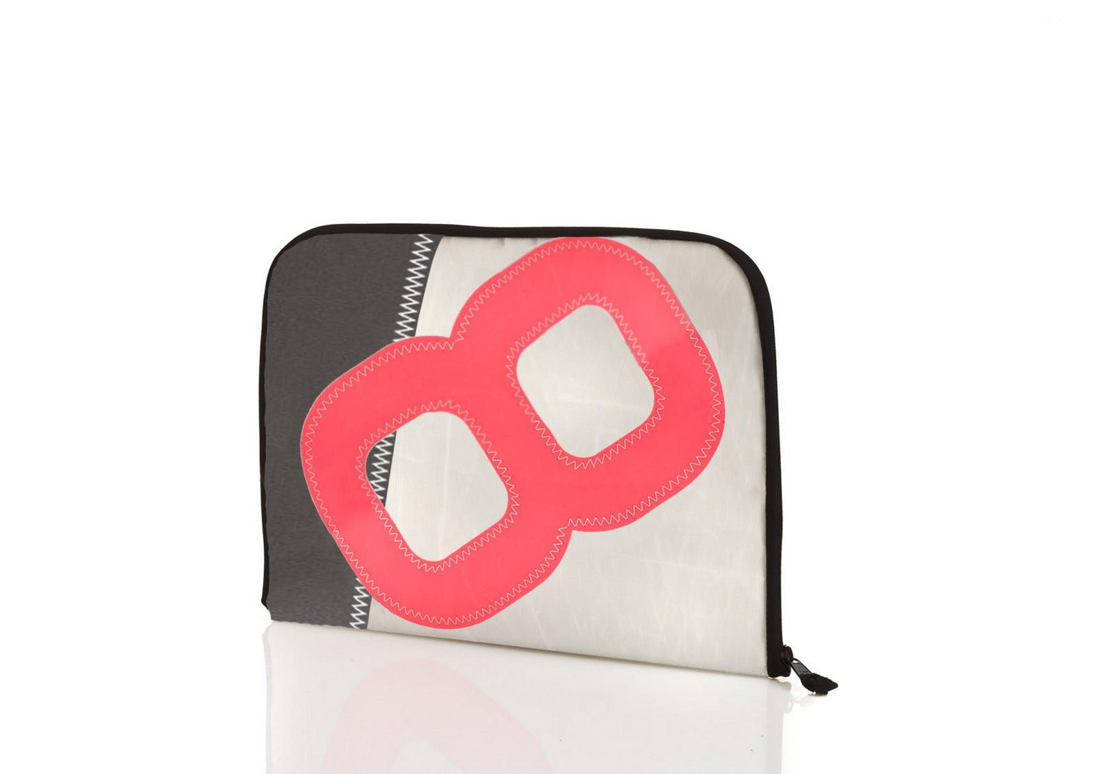 Housse d'ordinateur en toiles de voiles de bateaux recycléesN° : 1/1 Création uniqueDesign : Roger / Beyou créateursVoile : Grand voileBateau / skipper : Bateau de croisièreOcéan / course : Mer Mediterranée, Océan Atlantique