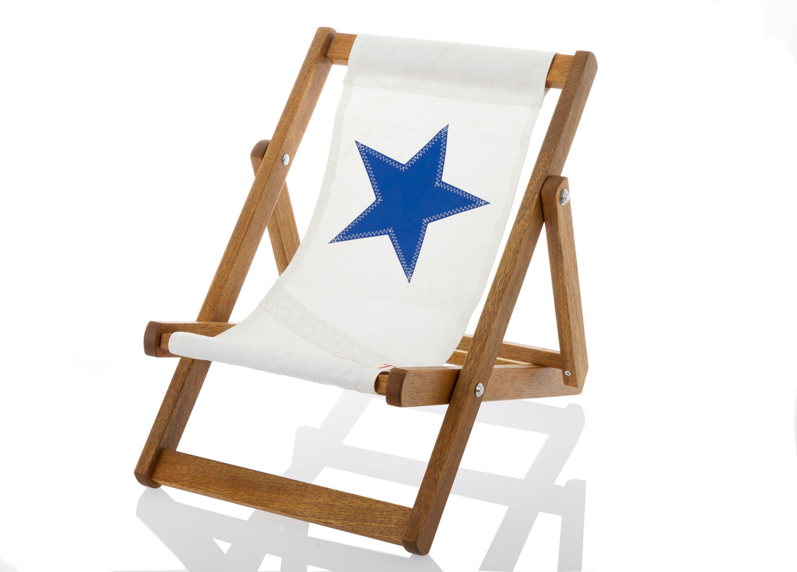 Le Mini-Transat Etoile bleu est réalisé en voile de bateau 100% recyclée, avec l'étoile bleu cousu avec notre iconique point zigzag et la structure en bois exotique.